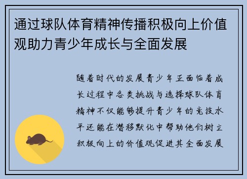 通过球队体育精神传播积极向上价值观助力青少年成长与全面发展